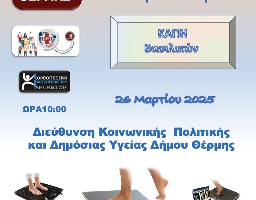Το Κ.Ε.Π.Υγείας του Δήμου Θέρμης, σε συνεργασία με τα Ορθοπεδικά Χατζηγεωργίου, θα πραγματοποιήσουν εξέταση στατικής και δυναμικής μέτρησης – Πελματογράφημα, την Τετάρτη 26 Μαρτίου 2025 και ώρα 10:00, στο ΚΑΠΗ Βασιλικών.