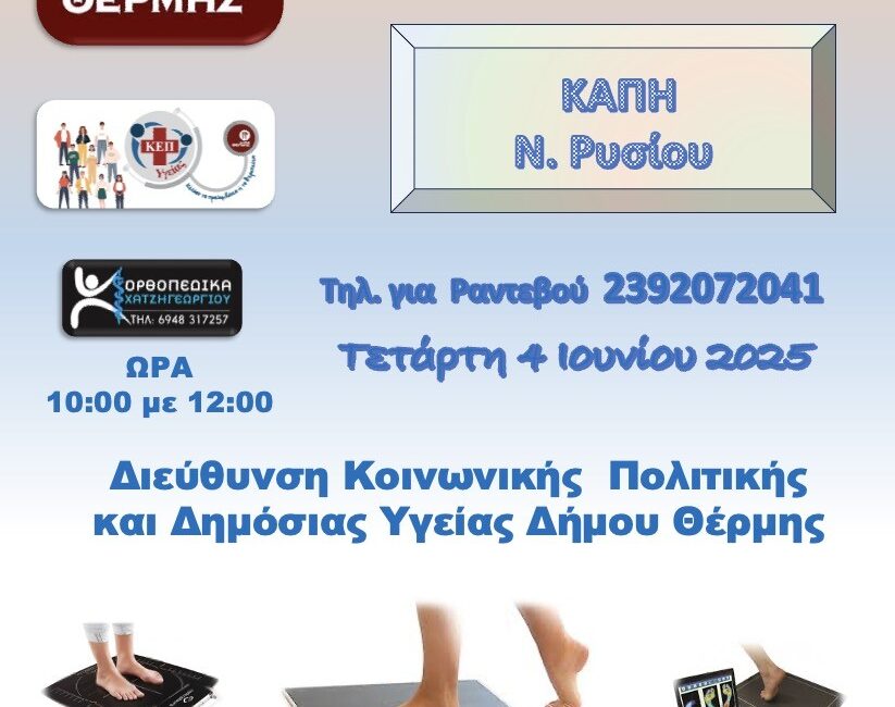 Το ΚΕ.Π .Υγείας Δήμου Θέρμης, σε συνεργασία με τα Ορθοπεδικά Χατζηγεωργίου, θα πραγματοποιήσουν Πελματογράφημα – Στατικού – Δυναμικού, στο κτίριο του ΚΑΠΗ Νέου Ρυσίου, την Τετάρτη 4 Ιουνίου 2025 και ώρες 10.00 έως 12.00. Τηλέφωνο για ραντεβού στο 2392072041.