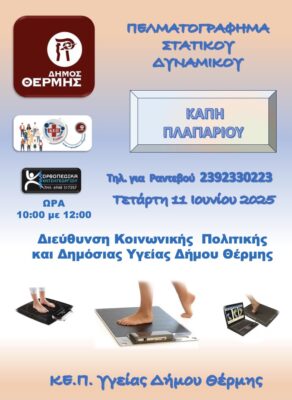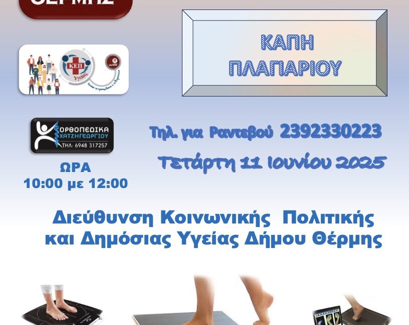 Το ΚΕ.Π. Υγείας Δήμου Θέρμης, σε συνεργασία με τα Ορθοπεδικά Χατζηγεωργίου, θα πραγματοποιήσουν Πελματογράφημα – Στατικού – Δυναμικού, στο κτίριο του ΚΑΠΗ του Πλαγιαρίου, την Τετάρτη 11 Ιουνίου 2025 και ώρες 10.00 έως 12.0.