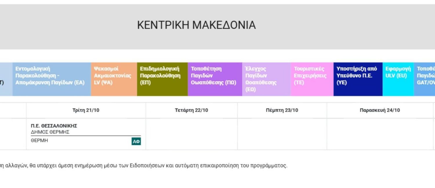 Συνεχίζεται το πρόγραμμα καταπολέμησης κουνουπιών (προνυμφοκτονία και ακμαιοκτονία), καθώς και άλλων ενοχλητικών εντόμων, στην περιοχή του δήμου Θέρμης, το οποίο υλοποιεί η Περιφέρεια Κεντρικής Μακεδονίας. Το πρόγραμμα καταπολέμησης περιλαμβάνει δράσεις στο φυσικό και στο περιαστικό περιβάλλον όλων των οικισμών του δήμου, έως και δύο χιλιόμετρα πέριξ αυτών, καθώς και στις αστικές εστίες και εντός των ιδιοκτησιών σε όλες τις Κοινότητες του δήμου Θέρμης.