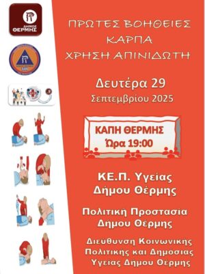 – Τέλος, τη Δευτέρα 29 Σεπτεμβρίου διοργανώνεται σεμινάριο Πρώτων Βοηθειών – ΚΑΡΠΑ και χρήση απινιδωτή, στο ΚΑΠΗ Θέρμης, στις 19:00.