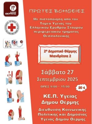 – Το Σάββατο το ΚΕ.Π. Υγείας του Δήμου Θέρμης, σε συνεργασία με τον Τομέα Υγείας του Ελληνικού Ερυθρού Σταυρού, του περιφερειακού τμήματος Θεσσαλονίκης, διοργανώνει κατά τις ώρες 9:00 – 15:00, στο 2ο δημοτικό σχολείο Θέρμης (Μανδρίτσας 2), εξάωρο σεμινάριο πρώτων βοηθειών με πιστοποίηση από τον Ελληνικό Ερυθρό Σταυρό. Τo αντίτιμο του σεμιναρίου ανέρχεται στα 20 ευρώ.