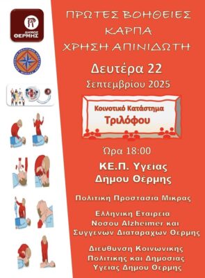 – Το ΚΕ.Π. Υγείας της Διεύθυνσης Κοινωνικής Πολιτικής και Δημόσιας Υγείας του Δήμου Θέρμης, σε συνεργασία με την Πολιτική Προστασία Μίκρας στο πλαίσιο της ενημέρωσης των πολιτών, διοργανώνει σεμινάριο Πρώτων Βοηθειών – ΚΑΡΠΑ και χρήση απινιδωτή στο Κοινοτικό Κατάστημα Τριλόφου, την Δευτέρα 22 Σεπτεμβρίου 2025 και ώρα 18:00.