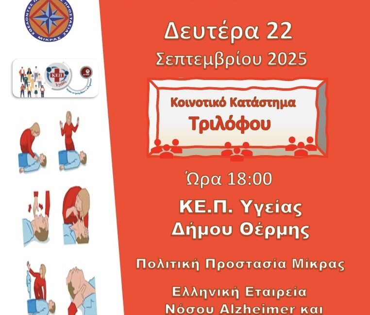 – Το ΚΕ.Π. Υγείας της Διεύθυνσης Κοινωνικής Πολιτικής και Δημόσιας Υγείας του Δήμου Θέρμης, σε συνεργασία με την Πολιτική Προστασία Μίκρας στο πλαίσιο της ενημέρωσης των πολιτών, διοργανώνει σεμινάριο Πρώτων Βοηθειών – ΚΑΡΠΑ και χρήση απινιδωτή στο Κοινοτικό Κατάστημα Τριλόφου, την Δευτέρα 22 Σεπτεμβρίου 2025 και ώρα 18:00.