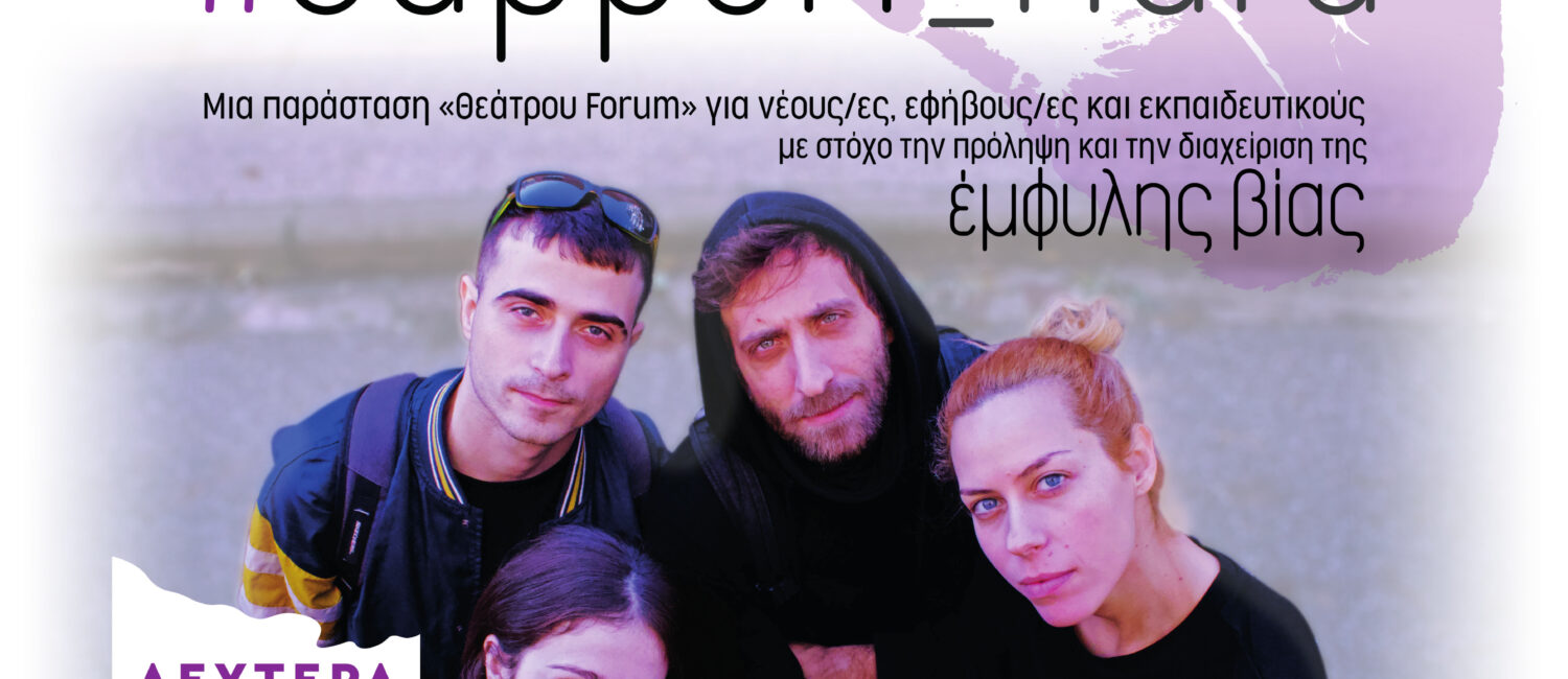 Μια παράσταση «θεάτρου Forum» για την ευαισθητοποίηση του κοινού σε θέματα πρόληψης και διαχείρισης της έμφυλης βίας. Η πρωτοβουλία αυτή, που απευθύνεται σε νέους/ες, εφήβους/ες, γονείς και εκπαιδευτικούς, έχει ως στόχο την πρόληψη και την διαχείριση της έμφυλης βίας, ενώ παράλληλα αναδεικνύει τη σημασία της πρόληψης των εξαρτήσεων και της προαγωγής της ψυχοκοινωνικής υγείας.