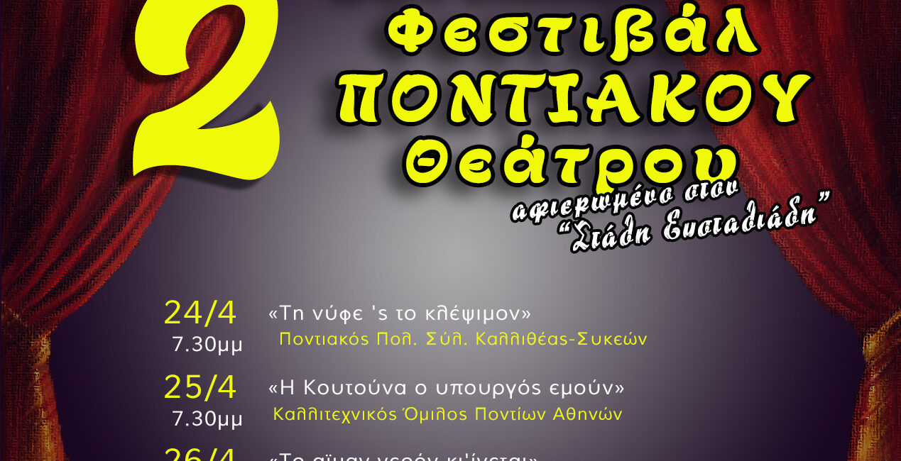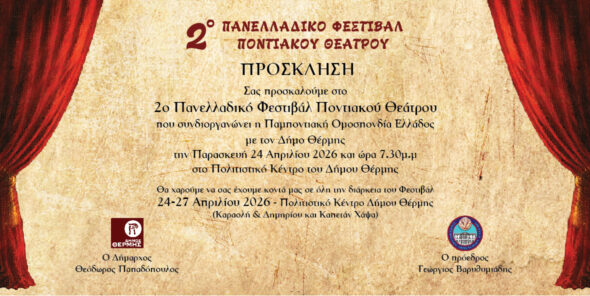 Η Παμποντιακή Ομοσπονδία Ελλάδος, σε συνδιοργάνωση με τους Δήμους Θέρμης και Κορδελιού-Ευόσμου, παρουσιάζει το 2ο Πανελλαδικό Φεστιβάλ Ποντιακού Θεάτρου, μια σημαντική πολιτιστική διοργάνωση που προάγει τη διατήρηση και ανάδειξη της ποντιακής θεατρικής παράδοσης. Το φεστιβάλ θα φιλοξενήσει συνολικά 10 ερασιτεχνικά ποντιακά θεατρικά σχήματα από όλη την Ελλάδα, προσφέροντας στο κοινό ένα πλούσιο πρόγραμμα παραστάσεων με ελεύθερη είσοδο για όλους.