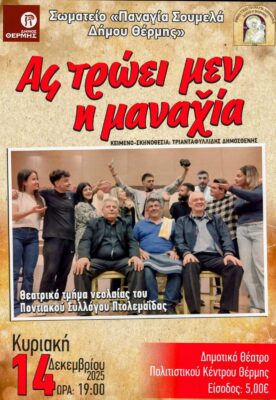 Δύο εκδηλώσεις διοργανώνει τις επόμενες ημέρες το σωματείο «Παναγία Σουμελά Δήμου Θέρμης. Η πρώτη αφορά τη θεατρική παράσταση «Ας τρώει μεν η μανασία» η οποία θα πραγματοποιηθεί την Κυριακή 14 Δεκεμβρίου και ώρα 19:00 στο Πολιτιστικό Κέντρο Θέρμης. Η παράσταση παρουσιάζεται από το Τμήμα Νεολαίας του Ποντιακού Συλλόγου Πτολεμαΐδας και υπόσχεται να ταξιδέψει τους θεατές σε μια απολαυστική και γεμάτη χιούμορ εμπειρία, βασισμένη στις ποντιακές παραδόσεις και τα ήθη. Μην χάσετε την ευκαιρία να απολαύσετε αυτή τη μοναδική θεατρική παράσταση, που τιμά τις ποντιακές ρίζες και την παράδοση με έναν φρέσκο και δυναμικό τρόπο! Τιμή εισόδου: 5€. Επίσης, την Τετάρτη 17 Δεκεμβρίου και ώρα 20:00 στο εστιατόριο Θερμαΐς το σωματείο “Παναγία Σουμελά Δήμου Θέρμης” διοργανώνει ποντιακή φιλανθρωπική βραδιά με σκοπό να ενισχύσει τις φιλανθρωπικές δράσεις του σωματείου.