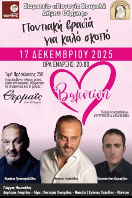 Δύο εκδηλώσεις διοργανώνει τις επόμενες ημέρες το σωματείο «Παναγία Σουμελά Δήμου Θέρμης. Η πρώτη αφορά τη θεατρική παράσταση «Ας τρώει μεν η μανασία» η οποία θα πραγματοποιηθεί την Κυριακή 14 Δεκεμβρίου και ώρα 19:00 στο Πολιτιστικό Κέντρο Θέρμης. Η παράσταση παρουσιάζεται από το Τμήμα Νεολαίας του Ποντιακού Συλλόγου Πτολεμαΐδας και υπόσχεται να ταξιδέψει τους θεατές σε μια απολαυστική και γεμάτη χιούμορ εμπειρία, βασισμένη στις ποντιακές παραδόσεις και τα ήθη. Μην χάσετε την ευκαιρία να απολαύσετε αυτή τη μοναδική θεατρική παράσταση, που τιμά τις ποντιακές ρίζες και την παράδοση με έναν φρέσκο και δυναμικό τρόπο! Τιμή εισόδου: 5€. Επίσης, την Τετάρτη 17 Δεκεμβρίου και ώρα 20:00 στο εστιατόριο Θερμαΐς το σωματείο “Παναγία Σουμελά Δήμου Θέρμης” διοργανώνει ποντιακή φιλανθρωπική βραδιά με σκοπό να ενισχύσει τις φιλανθρωπικές δράσεις του σωματείου.