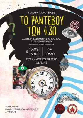 Η Θεατρική Ομάδα ΑΛΜΑ του Πολιτιστικού Συλλόγου Τριλόφου παρουσιάζει την κωμωδία “Το Ραντεβού των 4.30” το Σάββατο 15 και την Κυριακή 16 Μαρτίου 2025 στις 19.30 μ.μ. στο Δημοτικό Θέατρο Θέρμης. Εκτός από τον ψυχαγωγικό χαρακτήρα το θεατρικό διήμερο έχει και κοινωνικό καθώς αντί εισιτηρίου οι θεατές μπορούν να προσφέρουν τρόφιμα και είδη πρώτης ανάγκης στο Κοινωνικό Παντοπωλείο και το Κοινωνικό Ιατρείο του Δήμου Θέρμης.