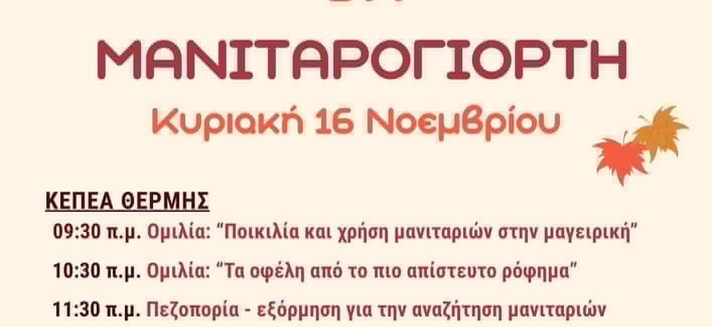 – Στο χώρο του ΚΕΠΕΑ ΘΕΡΜΗΣ και ώρα 09.30 το πρωί θα γίνει ομιλία με θέμα «Ποικιλία και χρήση μανιταριών στη μαγειρική». Θα ακολουθήσει στις 10.30 ομιλία για «το απίστευτο ρόφημα και τα οφέλη του».