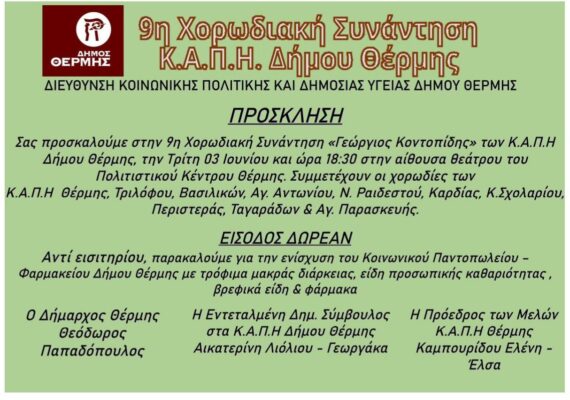 Μια όμορφη μουσική βραδιά με τις τετράφωνες Χορωδίες των ΚΑΠΗ του δήμου Θέρμης υπόσχονται τα μέλη των χορωδιών στο πλαίσιο της 9ης Χορωδιακής Συνάντησης «Γεώργιος Κοντοπίδης», η οποία θα διεξαχθεί στην αίθουσα Θεάτρου του Πολιτιστικού Κέντρου Θέρμης, την ερχόμενη Τρίτη 3 Ιουνίου και ώρα 18:30. Στην εκδήλωση τα χορωδιακά σύνολα των ΚΑΠΗ θα παρουσιάσουν ένα πολυσύνθετο ρεπερτόριο, υπό την καθοδήγηση των χορωδών τους, Θεόφιλου Γκίνη, Στυλιανού Ζαχαρίου και Μαρίας Τραγιάνη.