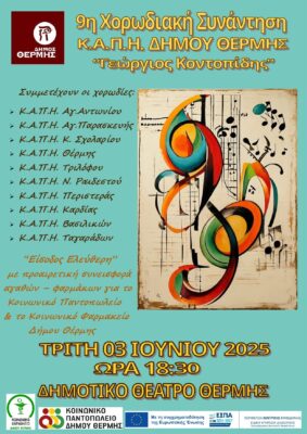 Μια όμορφη μουσική βραδιά με τις τετράφωνες Χορωδίες των ΚΑΠΗ του δήμου Θέρμης υπόσχονται τα μέλη των χορωδιών στο πλαίσιο της 9ης Χορωδιακής Συνάντησης «Γεώργιος Κοντοπίδης», η οποία θα διεξαχθεί στην αίθουσα Θεάτρου του Πολιτιστικού Κέντρου Θέρμης, την ερχόμενη Τρίτη 3 Ιουνίου και ώρα 18:30. Στην εκδήλωση τα χορωδιακά σύνολα των ΚΑΠΗ θα παρουσιάσουν ένα πολυσύνθετο ρεπερτόριο, υπό την καθοδήγηση των χορωδών τους, Θεόφιλου Γκίνη, Στυλιανού Ζαχαρίου και Μαρίας Τραγιάνη.