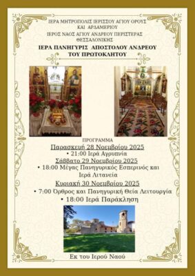Πανηγυρικό Εσπερινό το Σάββατο 29 Νοεμβρίου και ώρα 6 το απόγευμα, με Λιτανεία της Ιεράς Εικόνας Αγίου Αποστόλου Ανδρέα.