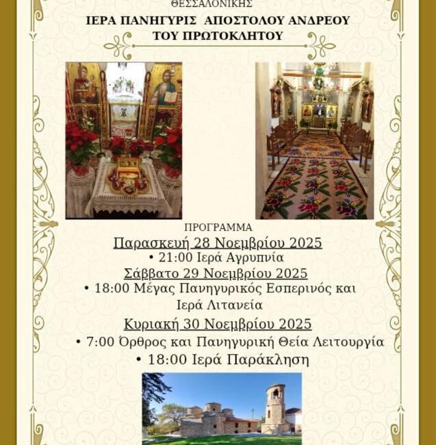 Πανηγυρικό Εσπερινό το Σάββατο 29 Νοεμβρίου και ώρα 6 το απόγευμα, με Λιτανεία της Ιεράς Εικόνας Αγίου Αποστόλου Ανδρέα.